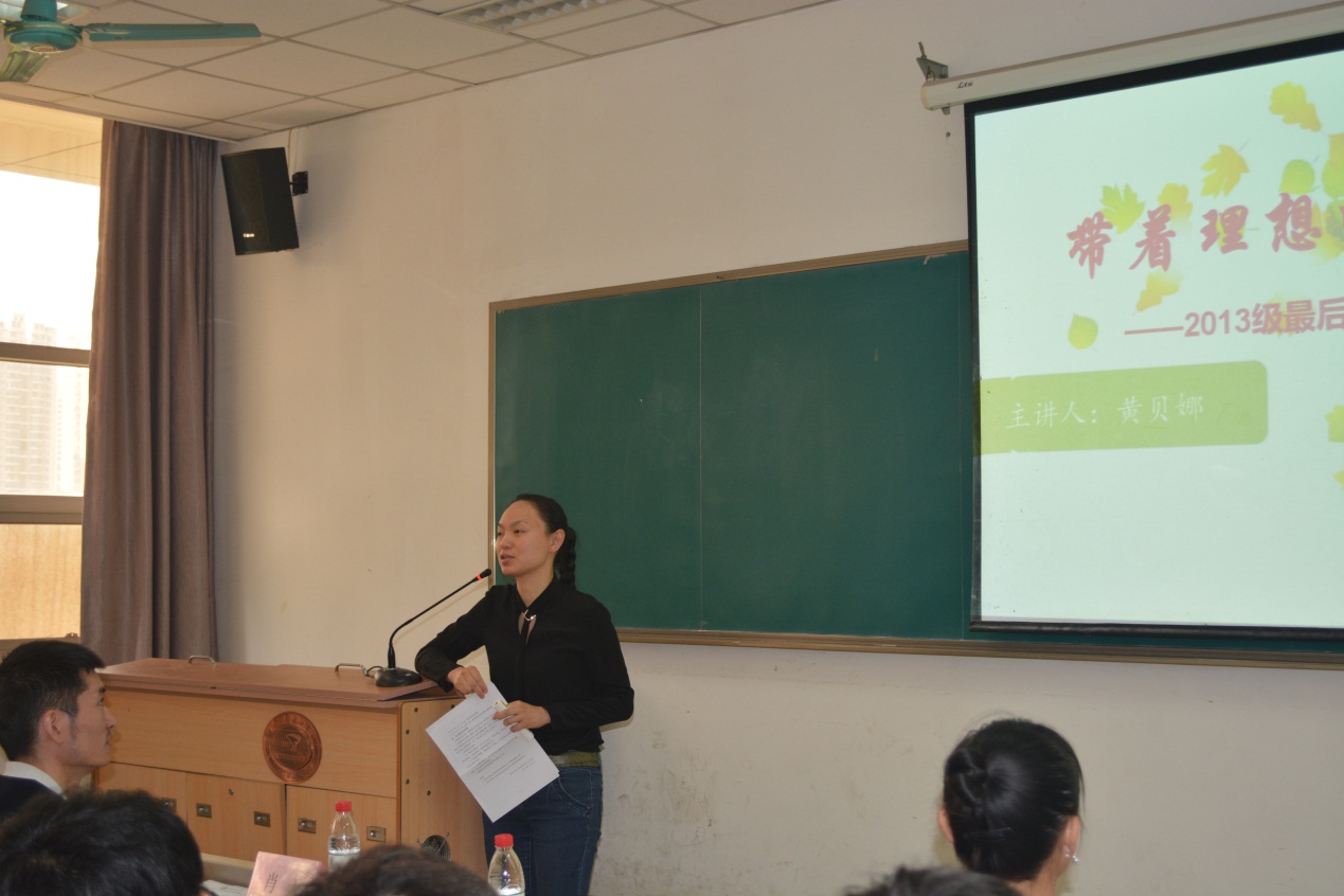 黄贝娜以 “带着理想向前飞”为主题、以习近平总书记在中国政法大学时的重要讲话“人要立志做大事,不要立志做大官”为开篇,提出大学生应该以为人民、为社会做出贡献的多少为评价自己的标准,去不断地接近真理,将个人价值与社会价值融合起来,以实现最高社会理想作为信仰。